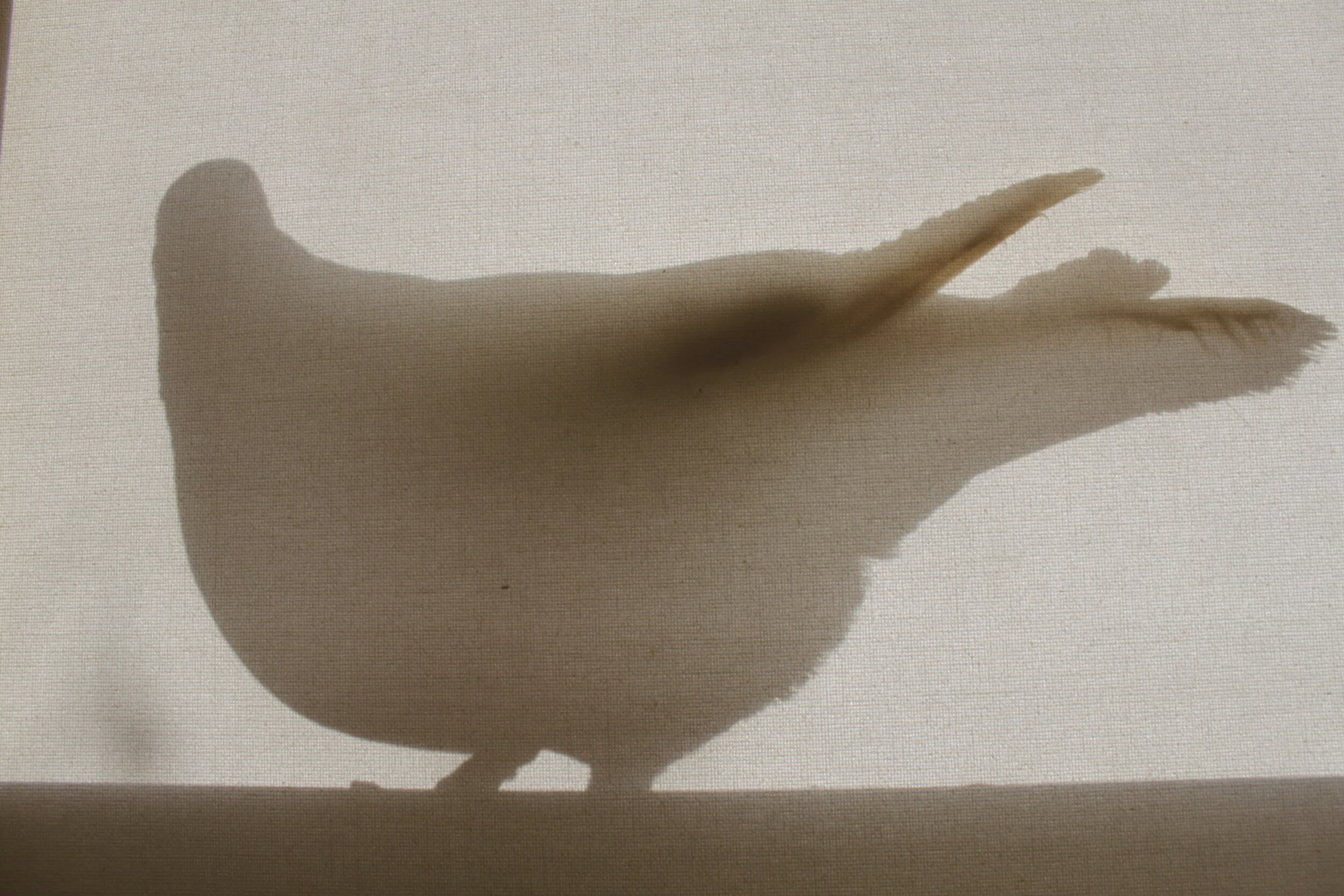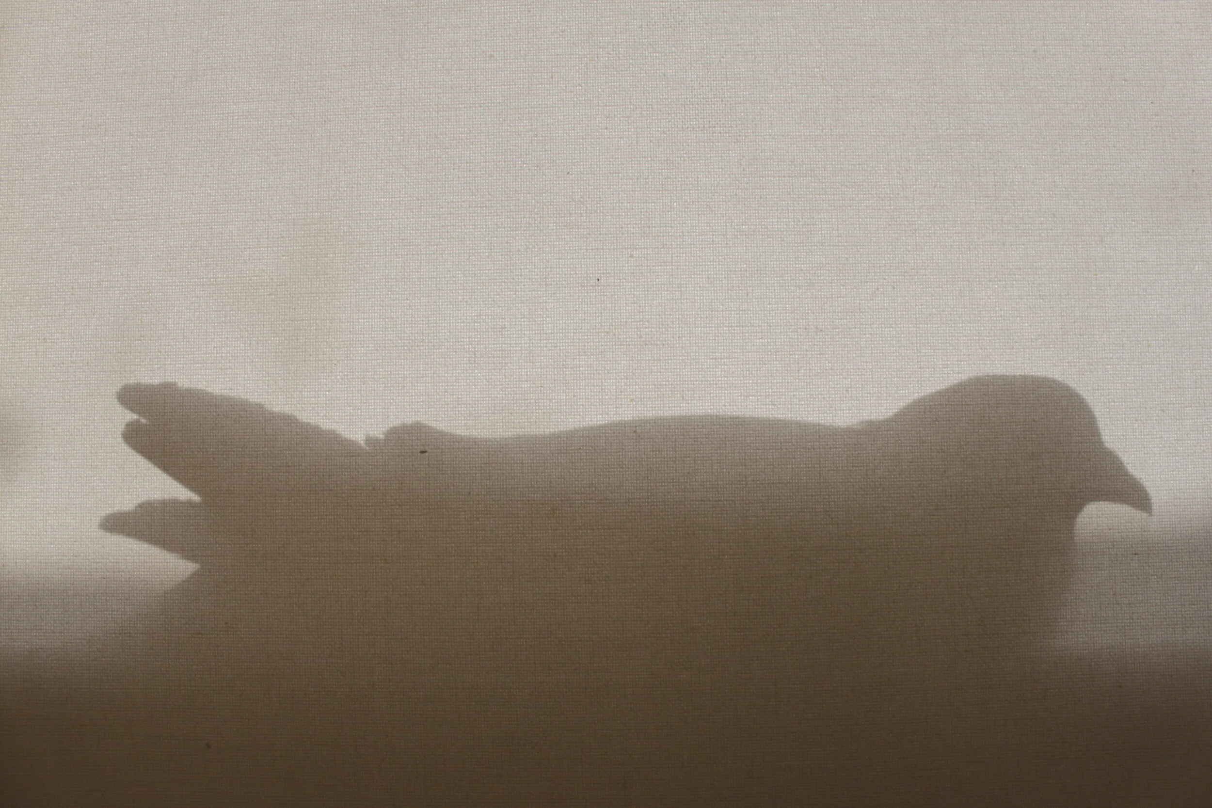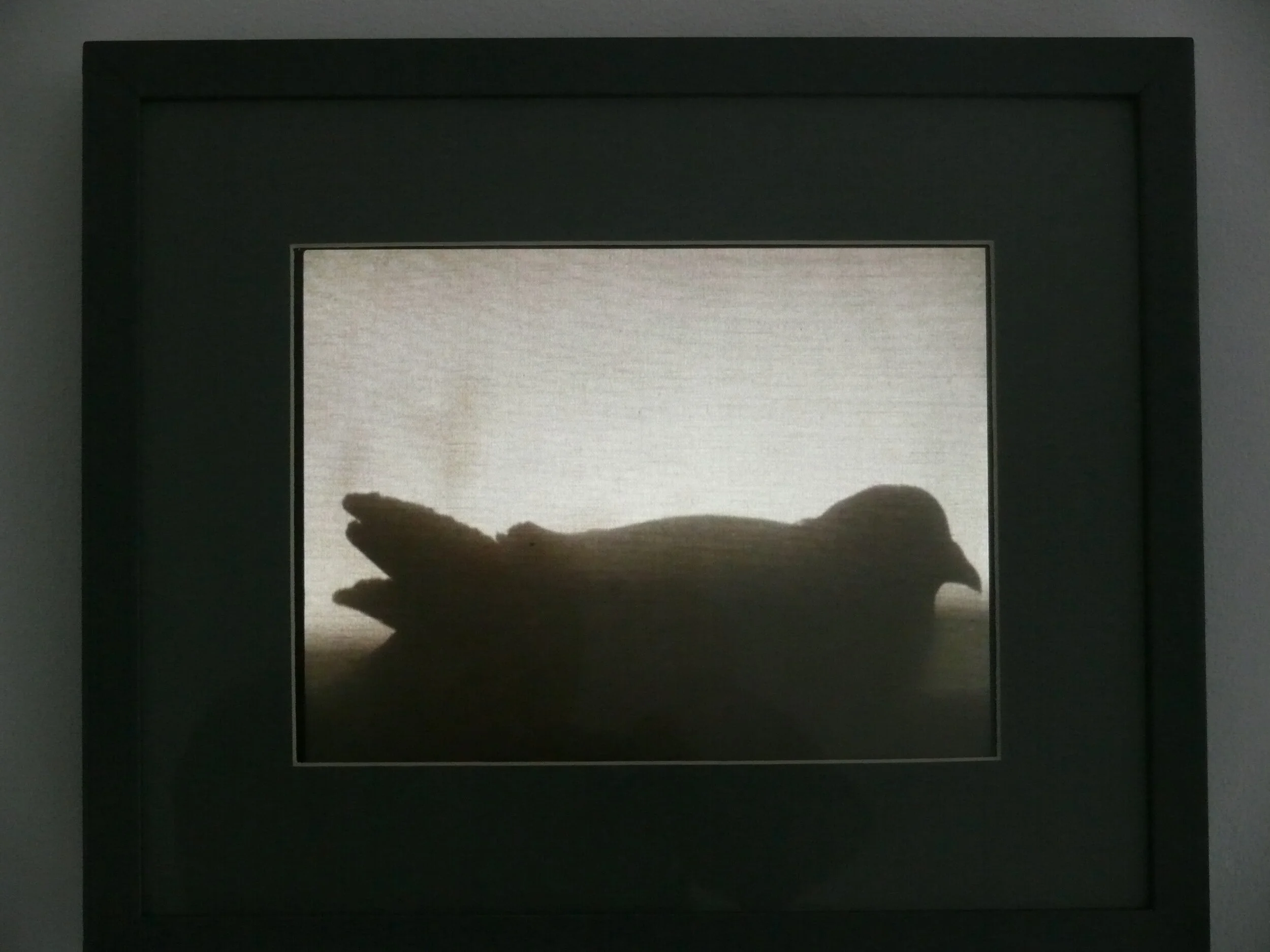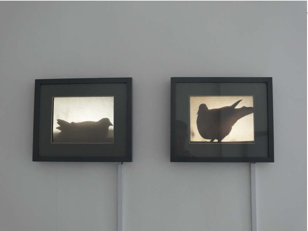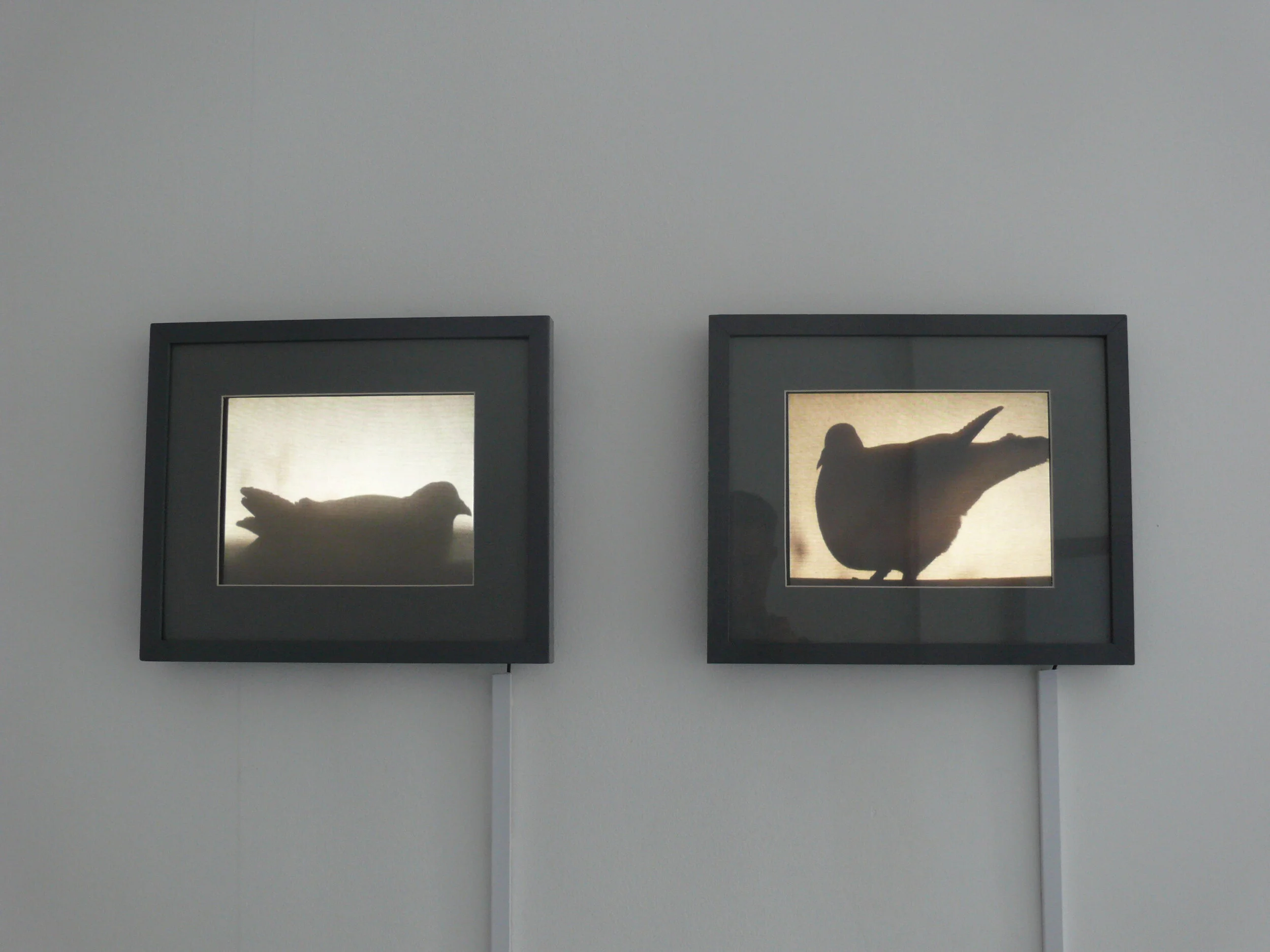The work explores the relationship between still and moving image in an attempt to captures the somber reality of confinement and the conditions of survival of living forms. In the work the presence of absence is captured in shadows and reflections of a single doves, sitting, resting, observing us as we observe them trapped within the frame. The silhouette of a dove, has been recurring image in my paintings, video and photographic works closely connected to early childhood memories of handling the birds, which my father kept on the rooftop of our home in the refugee camp, for myself the birds was one of my first experiences of an/other, another living being different from myself, and is an image which lingers with me. The image of the bird also carries a weight of political symbolism, which I attempt to reference and strip at the same time through close of observations of the dove, who cast in the weight of its shadow inevitably accepts its confinement in a still life.
